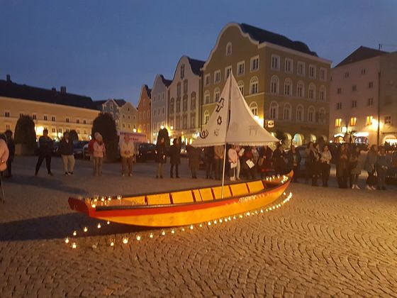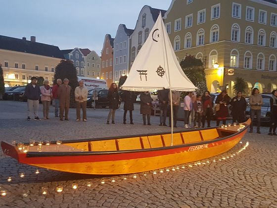 Evangelische, katholische, koptische und armenische Christen, Muslime und ein Vertreter der Sikh-Religion brachten Beiträge. In ihren Gesängen und Texten kam die Sehnsucht nach Frieden und die Verantwortung zu einem guten Zusammenleben zum Ausdruck. So wurde im Gesang zum Friedensgruß aus der armenischen Liturgie ostkirchliche Spiritualität erlebbar. Der muslimische Vertreter erinnerte daran, dass „jeder Moslem seinen Beitrag für das Wohl aller Menschen auf einem stabilen und friedlichen Schiff leisten“ muss. Und ein Gebet von Papst Franziskus lenkte den Blick auf die „Verlassenen und Vergessenen dieser Erde“ und die Verbundenheit mit allen Geschöpfen. Bei Tee und Kuchen klang der Abend aus. Ein besonderer Dank gilt der Feuerwehr Schärding, die die Zille zur Verfügung gestallt hat.