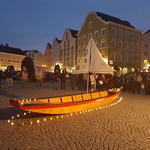 Man versammelte sich um ein Boot mit einem Segel, das die Symbole der einzelnen Religionen trug. Es erinnerte daran, dass wir alle in einem Boot sitzen.